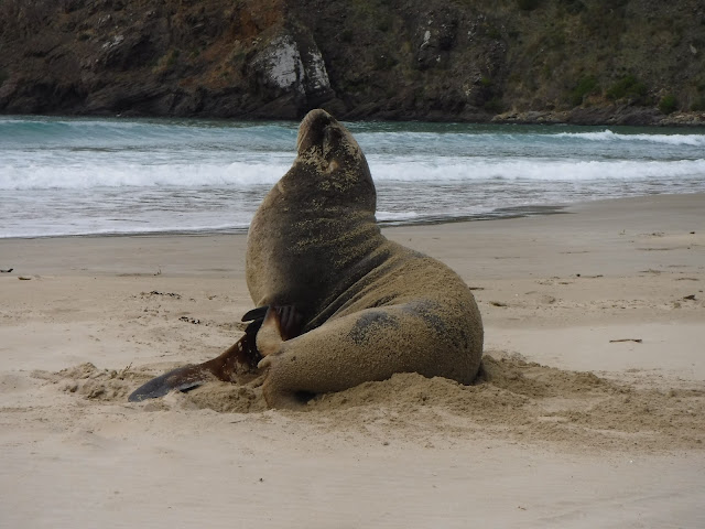 ... and then onto Kaka Point where we saw several sea lions on the sand as we drove out to Nugget Point and the lighthouse. From a distance we got to enjoy watching more fur seals in the water and sunbathing on the rocks.